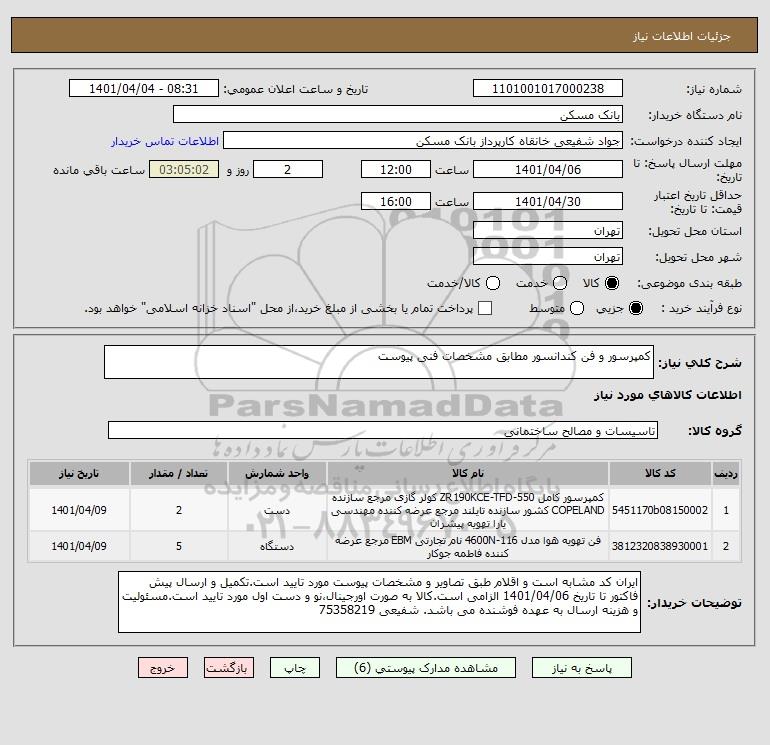 شرح کلی نیاز: کمپرسور و فن کندانسور مطابق مشخصات فنی پیوست