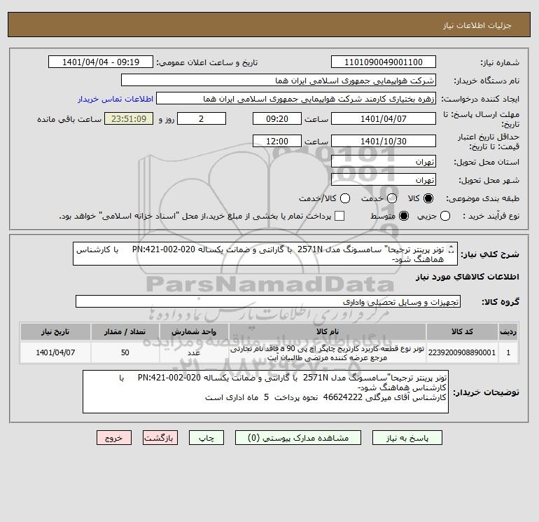 شرح کلی نیاز: تونر پرینتر ترجیحا" سامسونگ مدل 2571N با گارانتی و ضمانت یکساله PN:421-002-020 با کارشناس هماهنگ شود-