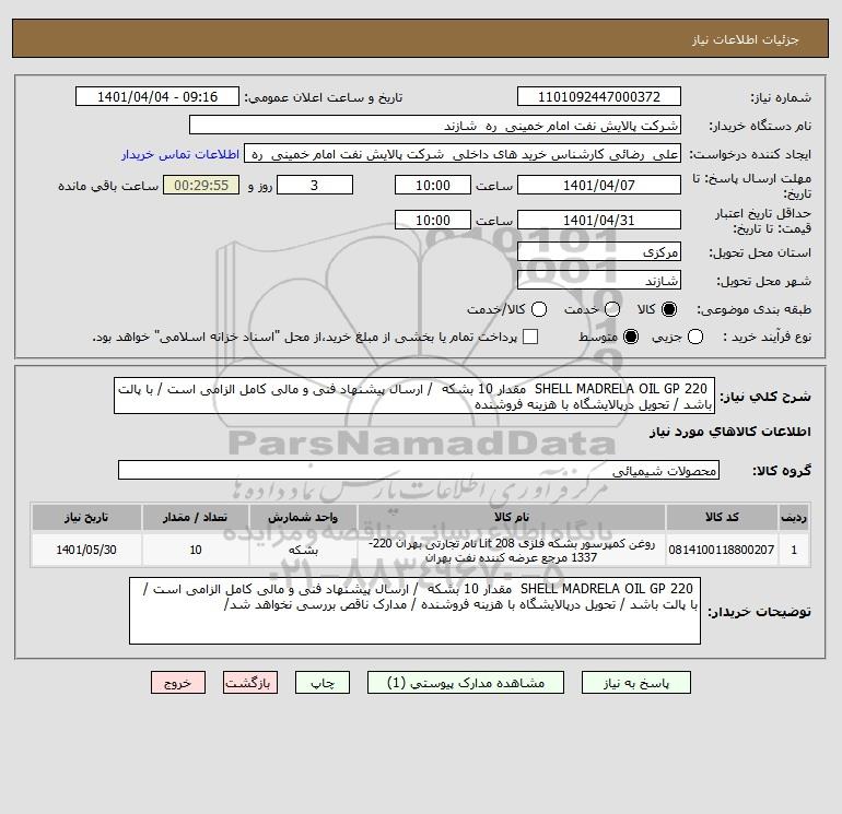 شرح کلی نیاز: SHELL MADRELA OIL GP 220 مقدار 10 بشکه / ارسال پیشنهاد فنی و مالی کامل الزامی است / با پالت باشد / تحویل درپالایشگاه با هزینه فروشنده