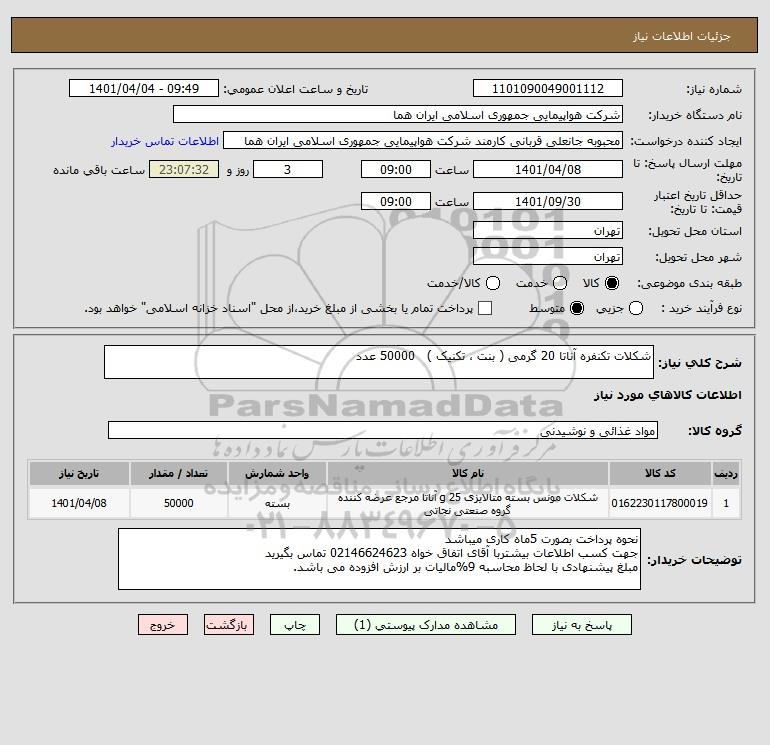شرح کلی نیاز: شکلات تکنفره آناتا 20 گرمی ( بنت ، تکنیک ) 50000 عدد