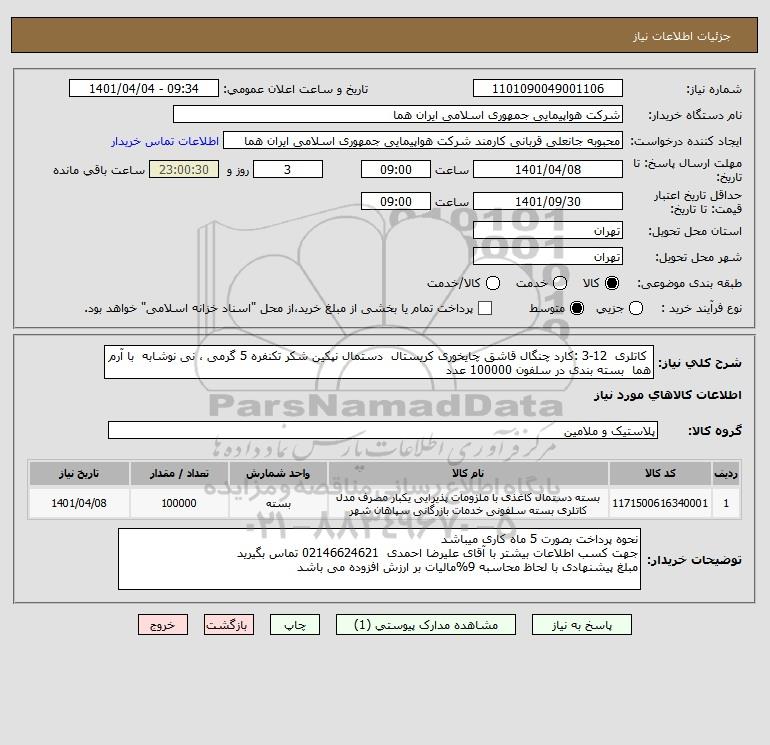 شرح کلی نیاز: کاتلری 12-3 :کارد چنگال قاشق چایخوری کریستال دستمال نپکین شکر تکنفره 5 گرمی ، نی نوشابه با آرم هما بسته بندی در سلفون 100000 عدد