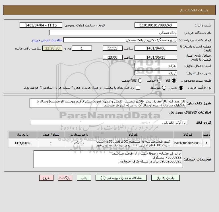شرح کلی نیاز: 18 عدد فیوز DC مطابق پیش فاکتور پیوست. تکمیل و ممهور نمودن پیش فاکتور پیوست الزامیست(ارسال یا بارگزاری سامانه)و عدم ارسال آن به منزله انصراف میباشد