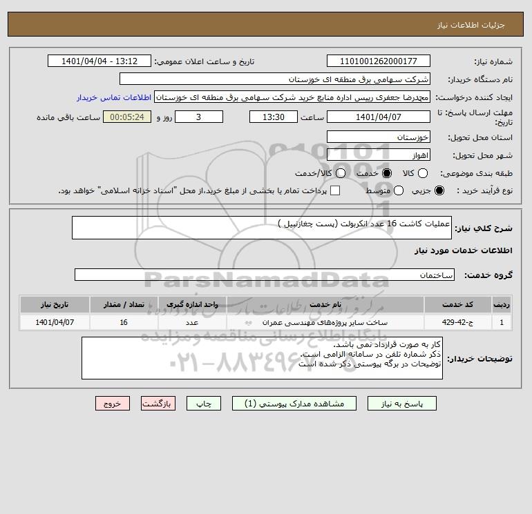 شرح کلی نیاز: عملیات کاشت 16 عدد انکربولت (پست چغازنبیل )