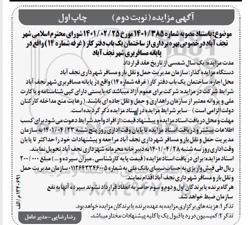 موضوع: در خصوص بهره برداری از ساختمان یکباب دفتر کار (غرفه شماره 14) واقع در پایانه مسافربری شهر نجف آباد