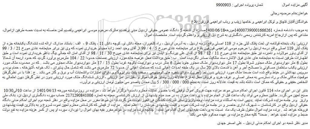 ،به موجب دادنامه شماره 140007390001666261مورخه1400/06/18صادره از شعبه 5 دادگاه عمومی حقوقی اردبیل مبنی برتقسیم ماترک مرحوم موسی ابراهیمی وتقسیم ثمن حاصله به نسبت حصه طرفین ازاموال مشاعی که پس ازارجاع امربه کارشناس رسمی دادگستری به شرح ذیل ارزیابی و واعلام گردیده است. مشخصات اموال