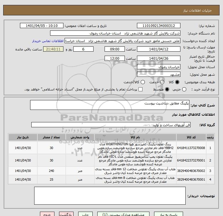 نام دستگاه خریدار:شرکت پالایش گاز شهید هاشمی نژاد استان خراسان رضوی