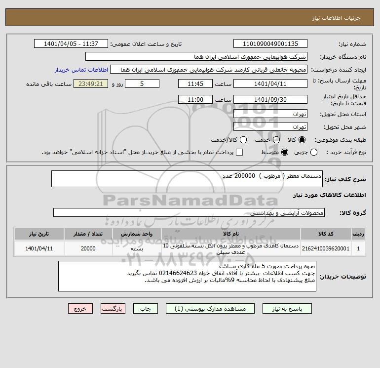 شرح کلی نیاز: دستمال معطر ( مرطوب ) 200000 عدد