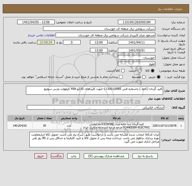 استعلام کلید گردان (کاوه ) باشماره فنی 1130010585 جهت کلیدهای 230و 400 کیلوولت پارس سوئیچ, استعلام کلید گردان (کاوه ) باشماره فنی 1130010585 جهت کلیدهای 230و 400 کیلوولت پارس سوئیچ