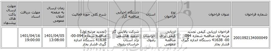 مناقصه، فراخوان ارزیابی کیفی تجدید مرتبه اول مناقصه شماره 094-00- 41638 دستگاه اندازه گیری فشار بخار, مناقصه، فراخوان ارزیابی کیفی تجدید مرتبه اول مناقصه شماره 094-00- 41638 دستگاه اندازه گیری فشار بخار