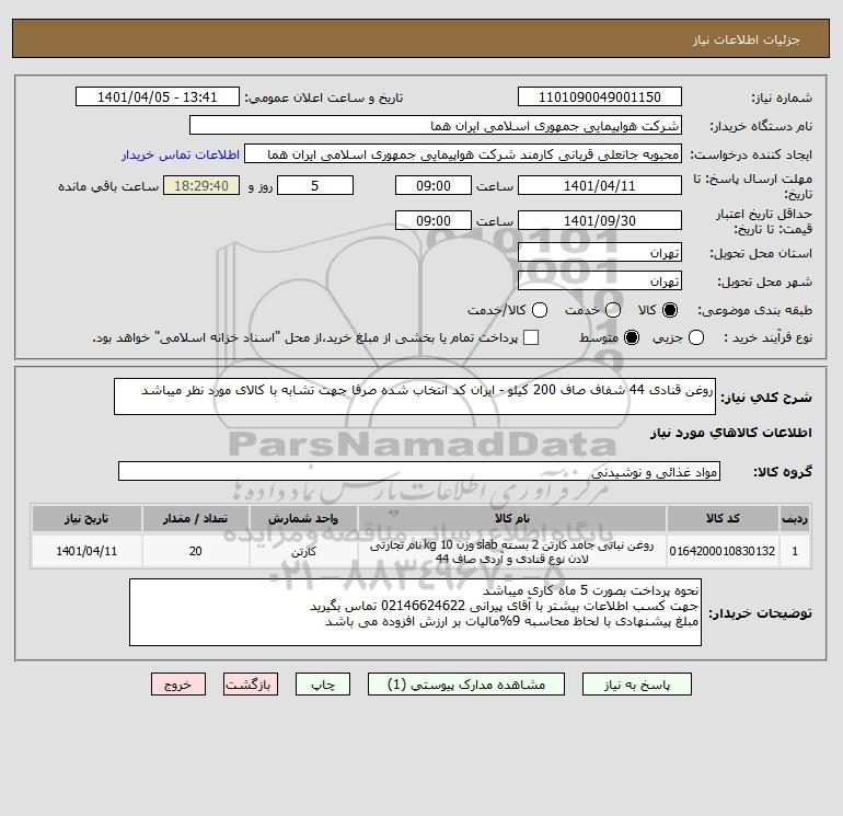 شرح کلی نیاز: روغن قنادی 44 شفاف صاف 200 کیلو - ایران کد انتخاب شده صرفا جهت تشابه با کالای مورد نظر میباشد