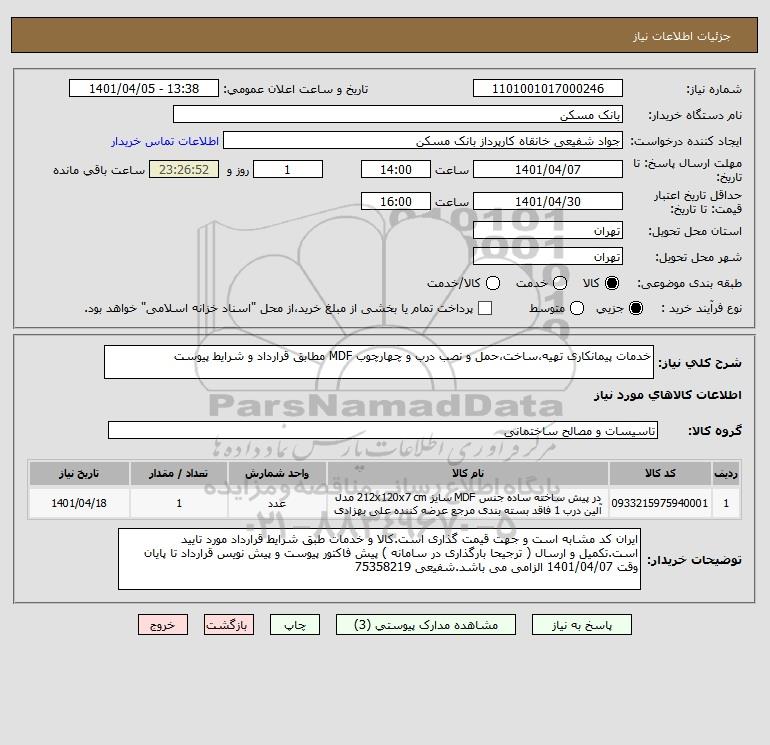 شرح کلی نیاز: خدمات پیمانکاری تهیه،ساخت،حمل و نصب درب و چهارچوب MDF مطابق قرارداد و شرایط پیوست