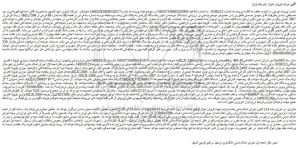 به موجب ابلاغیه شماره 140107100004187475 بتاریخ 1400/03/21،مبنی برارزیابی وتعیین ارزش وقیمت پایهِ اتومبیل سواری تویوتا کمری GLX-2400 مدل سال2007میلادی دارای شماره انتظامی91-691 ی94موضوع پرونده به شماره بایگانی0100213 دراین راستا ، اینجانب سرهنگ توفیق بالائی اردبیلی کارشناس رسمی دادگستری درکلیه رشته های مرتبط با امور وسائط نقلیه موتوری زمینی ومنتخب در مورخه1400/03/21 باحضوردردفترشعبه اوّل اجرای احکام مدنی دادگستری شهرستان اردبیل/قدیم ومطالعه پرونده مذکوروتحصیل اطلاعات مورد نیاز،درتداوم اقدامات کارشناسی به پارکینگ عمومی ایثار درشهرستان اردبیل عزیمت،وبا بازدید ومعاینه فنی ازاتومبیل سواری تویوتا کمری GLX-2400 موصوف ،و با در نظرگرفتن جمیع جهات وعوامل موثر،ارزش وقیمت پایه اتومبیل سواری تویوتا کمری GLX-2400 مدل 2007 میلادی مذکور،مشروط به داشتن کارائی مناسب وقابل بهره برداری بودن مجموعه موتورآن ،ضمن درج مشخصات فنی خودرومبحوث عنه در جدول ذیل ،تعیین واعلام میگردد. 1- نوع، سیستم و تیپ وشماره انتظامی خودرو* سواری تویوتا کمری GLX-2400 به شماره انتظامی91-691 ی94 2- تعداد محور* 2 تعداد چرخ* 4 تعداد سیلندر* 4 ظرفیت* جمعاً 5نفر 3- مدل ساخت سال 2007 میلادی رنگ* آبی متالیک نوع سوخت* بنزین 4- شماره موتور* *2AZA359993* ارقام حک شماره موتور فابریک میباشد. 5- شماره شاسی* *6T1BE42K57X386917* ارقام حک شماره شاسی فابریک میباشد 6- وضعیت کارآیی موتورـ دستگاه انتقال نیرو(گیربکس)ـ دیفرانسیل* تلویحاً مجموعه موتورودستگاه های مذکورسالم وآماده بکارمی باشند. 7- وضعیت و شرایط اتاق ومتعلقات* مجموعه اتاق واجزأ ومتعلقات آن با سابقه بازسازی قبلی دروضع موجود فعلی سالم وقابل استفاده میباشند. 8- وضعیت سیستم برق و روشنایی* سالم وقابل استفاده بودن سیستم روشنائی وبرق درمعاینه وآزمایش معموله محرز گردید. 9- قابلیت تعویض پلاک انتظامی مربوطه، مشروط به ارائه شدن، اسناد مالکیت ومدارک قانونی متعلقه را دارد. 10- قیمت پایه برای فروش درمزایده* به عدد -/4/750/000/000ریا ل به حروف: چهارمیلیارد وهفتصدوپنجاه میلیون ریال توضیحات : 1- بیمه نامه شخص ثالث صادره از شرکت بیمه دانا خودرو موصوف تا تاریخ 1401/07/25 معتبربوده ، وکارکردلاستیکهای منصوبه به چرخ ها ی آن در مجموع درحدود 20% میباشد. 2- کیلومترکارکرد سواری تویوتا کمری GLX-2400 مذکور به موجب نشانگرآن رقم *406963*میباشد واغلب قطعات واجزأ بدنه اتاق آن در سنوات قبل بازسازی وبا بتونه کاری تجدید نقاشی شده است. 3-به استناد سوابق موجود خودرو مذکوردارای مبلغ-/2/625/000ریال جریمه معوقه بوده وازتاریخ1400/02/26 در پارکینگ عمومی ایثاراردبیل متوقف شده ،وارزش وقیمت پایه آن بادر نظرگرفتن وضعیت وشرایط موجودی فعلی آن وپس از کسرکلیه هزینه های مربوطه منجمله مبلغ جریمه معوقه وهزینه نگهداری در پارکینگ و... وبا لحاظ جمیع جهات وعوامل موثردرشرایط نرخ بازار امروزی تعیین شده است