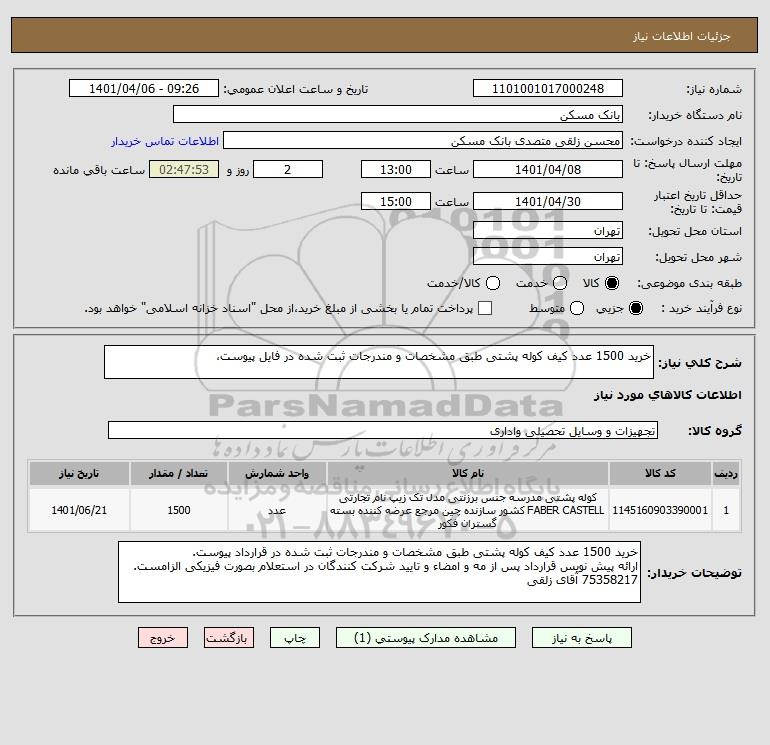 توضیحات خریدار:خرید 1500 عدد کیف کوله پشتی طبق مشخصات و مندرجات ثبت شده در قرارداد پیوست. ارائه پیش نویس قرارداد پس از مه و امضاء و تایید شرکت کنندگان در استعلام بصورت فیزیکی الزامست. 75358217 آقای زلقی
