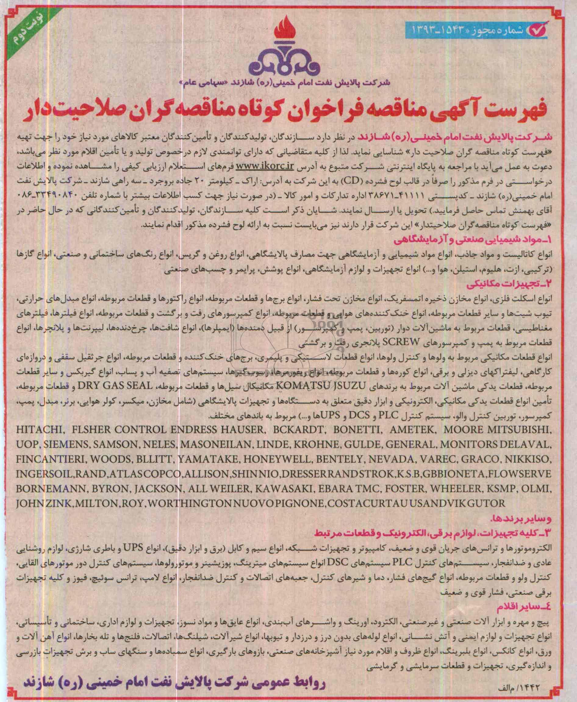 شرکت پالایش نفت امام خمینی ره شازند در نظر دارد سازندگان ، تولیدکنندگان و تامین کنندگان معتبر کالاهای موردنیاز خود را جهت تهیه فهرست کوتاه مناقصه گران صلاحیت دار شناسایی نماید. لذا از کلیه متقاضیانی که دارای توانمندی لازم در خصوص تولید و یا تامین اقلام موردنظر می باشند دعوت به عمل می آید با مراجعه به پایگاه اینترنتی شرکت متبوع به آدرس WWW.IKORC.IR فرم های استعلام ارزیابی کیفی را دریافت نموده و پس از تکمیل به همراه سایر اطلاعات درخواستی در فرم مذکور ، صرفا در قالب لوح فشرده CD به این شرکت تحویل یا ارسال نمایند. شایان ذکرا ست کلیه سازندگان ، تولیدکنندگان و تامین کنندگانی که در حال حاضر در فهرست کوتاه مناقصه گران صلاحیت دار این شرکت قرار دارند می بایست نسبت به ارائه لوح فشرده مذکور اقدام نمایند.
