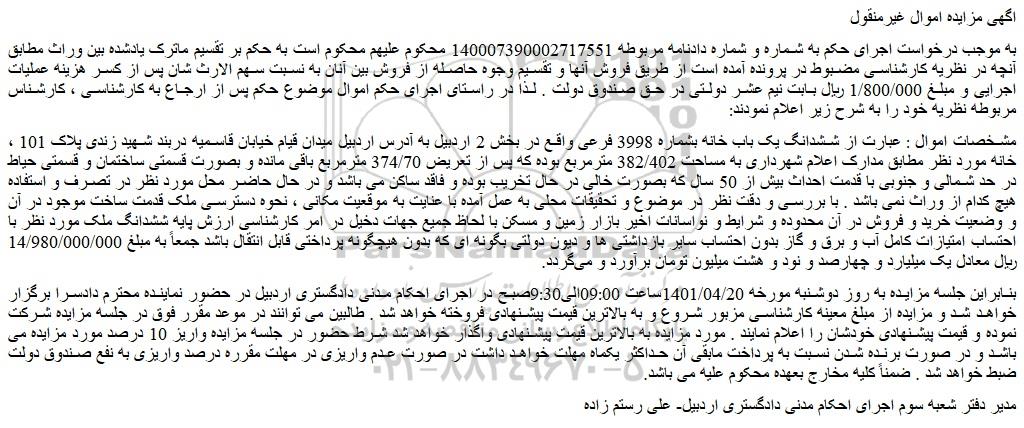 مشخصات اموال : عبارت از ششدانگ یک باب خانه بشماره 3998 فرعی واقع در بخش 2 اردبیل به آدرس اردبیل میدان قیام خیابان قاسمیه دربند شهید زندی پلاک 101 ، خانه مورد نظر مطابق مدارک اعلام شهرداری به مساحت 382/402 مترمربع بوده که پس از تعریض 374/70 مترمربع باقی مانده و بصورت قسمتی ساختمان و قسمتی حیاط در حد شمالی و جنوبی با قدمت احداث بیش از 50 سال که بصورت خالی در حال تخریب بوده و فاقد ساکن می باشد و در حال حاضر محل مورد نظر در تصرف و استفاده هیچ کدام از وراث نمی باشد . با بررسی و دقت نظر در موضوع و تحقیقات محلی به عمل آمده با عنایت به موقعیت مکانی ، نحوه دسترسی ملک قدمت ساخت موجود در آن و وضعیت خرید و فروش در آن محدوده و شرایط و نواسانات اخیر بازار زمین و مسکن با لحاظ جمیع جهات دخیل در امر کارشناسی ارزش پایه ششدانگ ملک مورد نظر با احتساب امتیازات کامل آب و برق و گاز بدون احتساب سایر بازداشتی ها و دیون دولتی بگونه ای که بدون هیچگونه پرداختی قابل انتقال باشد جمعاً به مبلغ 14/980/000/000 ریال معادل یک میلیارد و چهارصد و نود و هشت میلیون تومان برآورد و می گردد.