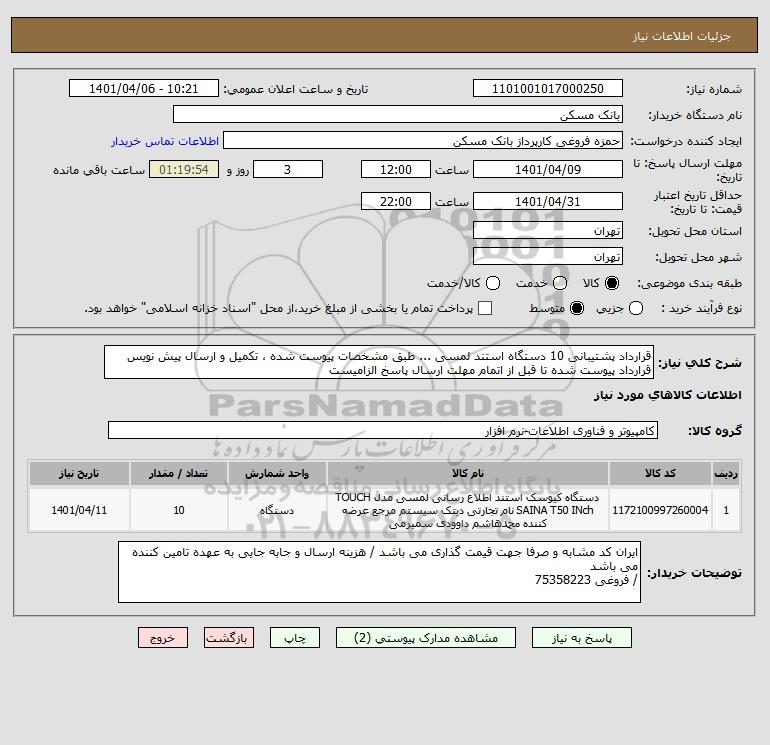 شرح کلی نیاز: قرارداد پشتیبانی 10 دستگاه استند لمسی ... طبق مشخصات پیوست شده ، تکمیل و ارسال پیش نویس قرارداد پیوست شده تا قبل از اتمام مهلت ارسال پاسخ الزامیست