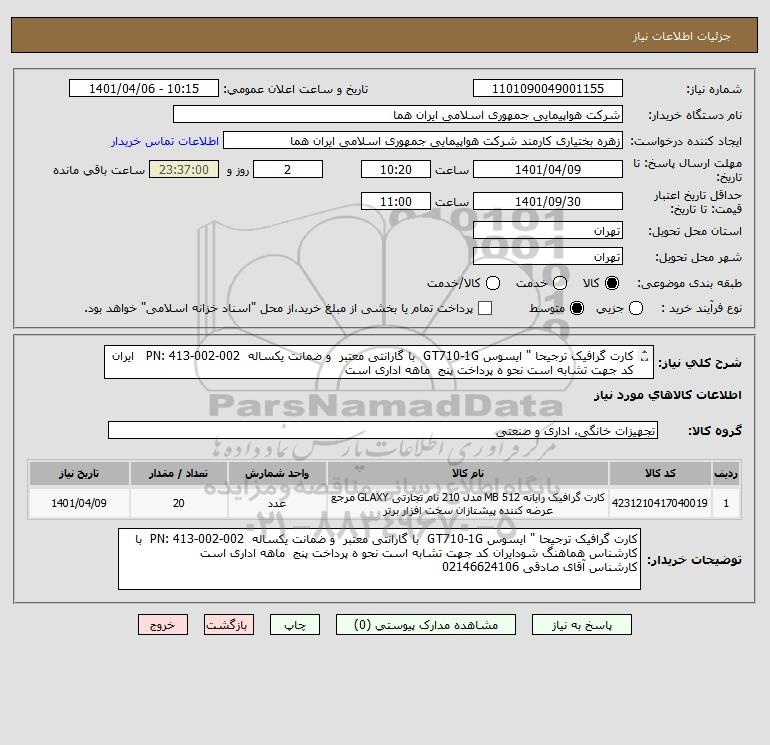 شرح کلی نیاز: کارت گرافیک ترجیحا " ایسوس GT710-1G با گارانتی معتبر و ضمانت یکساله PN: 413-002-002 ایران کد جهت تشابه است نحو ه پرداخت پنج ماهه اداری است