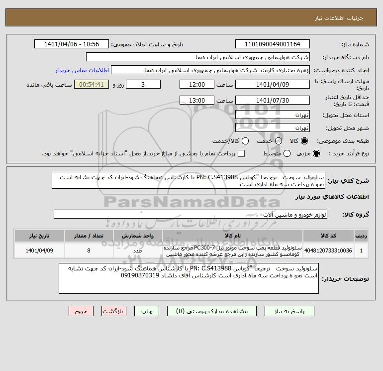 شرح کلی نیاز: سلونوئید سوخت ترجیحا "کوباس PN: C.S413988 با کارشناس هماهنگ شود-ایران کد جهت تشابه است نحو ه پرداخت سه ماه اداری است