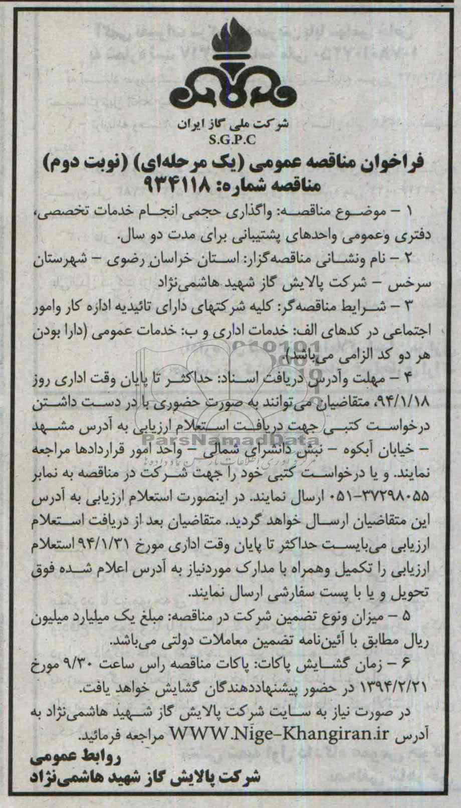 زمان گشایش پاکات : پاکات مناقصه راس ساعت 9/30 مورخ 94.2.21 در حضور پیشنهاددهندگان گشایش خواهد یافت
