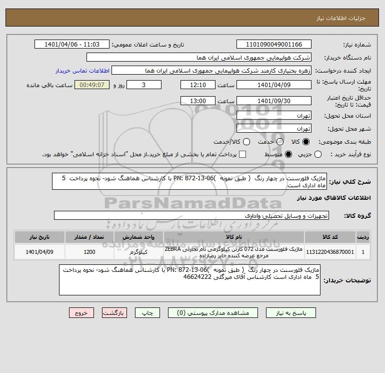 شرح کلی نیاز: ماژیک فلورسنت در چهار رنگ ( طبق نمونه )PN: 872-13-06 با کارشناس هماهنگ شود- نحوه پرداخت 5 ماه اداری است