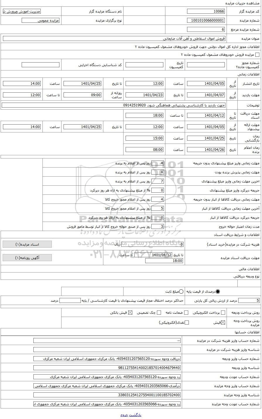 | شماره حساب واریز وجه مزایده | درآمدی-4054031203565066- بانک مرکزی جمهوری اسلامی ایران شعبه مرکزی جمهوری اسلامی ایران |
