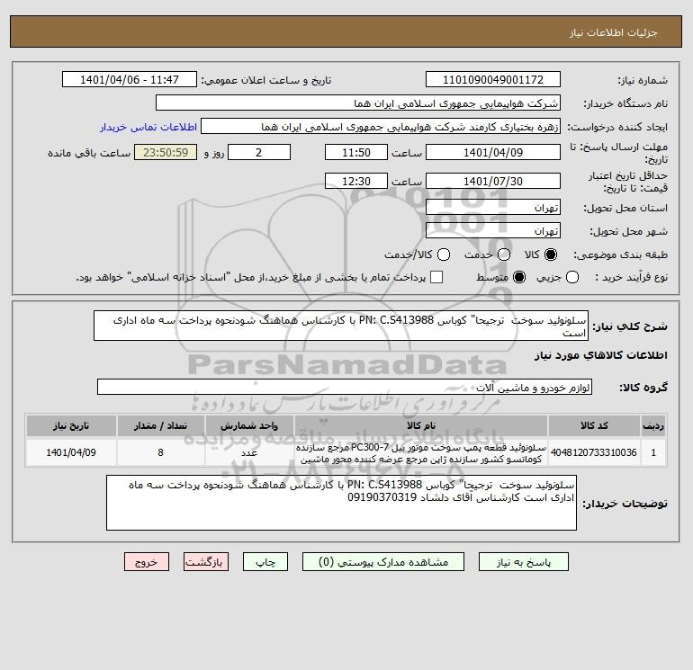 شرح کلی نیاز: سلونوئید سوخت ترجیحا" کوباس PN: C.S413988 با کارشناس هماهنگ شودنحوه پرداخت سه ماه اداری است