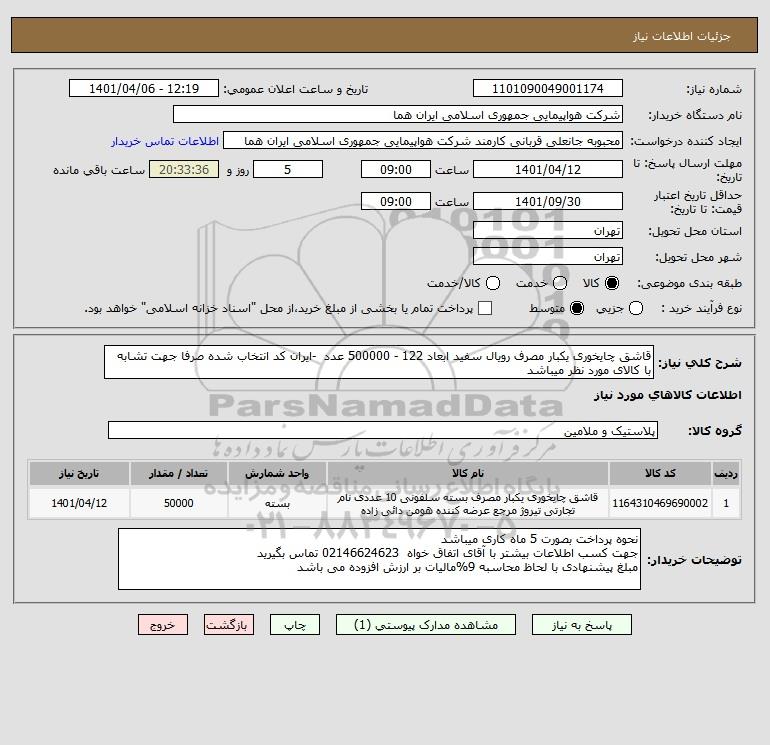 شرح کلی نیاز: قاشق چایخوری یکبار مصرف رویال سفید ابعاد 122 - 500000 عدد -ایران کد انتخاب شده صرفا جهت تشابه با کالای مورد نظر میباشد