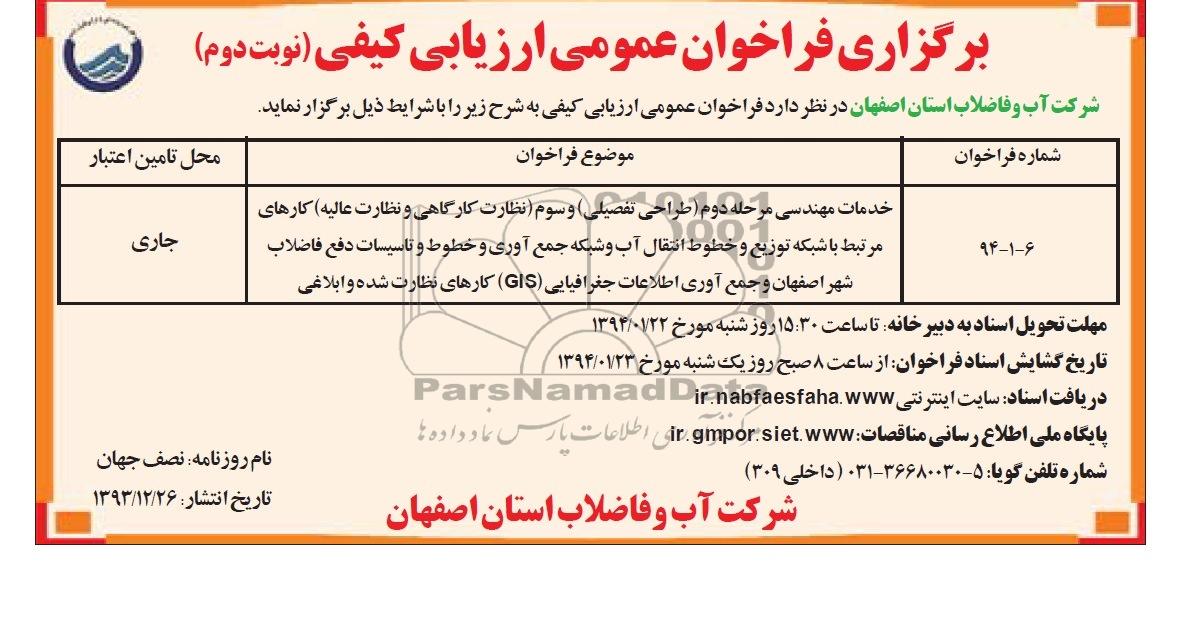 شماره فراخوان 94-1-6 موضوع فراخوان خدمات مهندسی مرحله دوم طراحی تفصیلی و سوم (نظارت کارگاهی و نظارت عالیه ) کارهای مرتبط و با شبکه توزیع و خطوط انتقال آب و شبکه جمع آوری و خطوط و تاسیسات دفع فاضلاب شهر اصفهان و جمع آوری اطلاعات جغرافیایی ( GIS) کارهای نظارت شده و ابلاغی