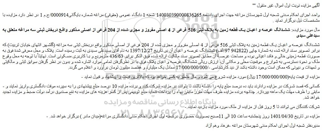 مال مورد مزایده: ششدانگ عرصه و اعیان یک قطعه زمین به پلاک ثبتی 516 فرعی از 4 اصلی مفروز و مجزی شده از 204 فرعی از اصلی مذکور واقع دربخش ثبتی سه مراغه متعلق به سیدعلی سیدی