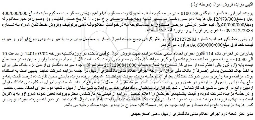 پرونده اجرایی به شماره  بایگانی 0100189 مبنی بر محکوم علیه :حامدپولادوند، محکوم له:ابراهیم بهشتی محکو میت محکوم علیه به مبلغ 400/000/000 ریال ومبلغ12/479/000ریال هزینه دادرسی وخسارت تاخیر تادیه وجه چک برمبنای نرخ تورم از تاریخ صدورلغایت روز وصول درحق محکوم له ومبلغ20/000/000ریال نیم عشر دولتی  درحق صندوق دولت،باتوجه به درخواست محکوم له مبنی برتوقیف وفروش خط تلفن همراه به شماره 09121272883، به شرح زیر ارزیابی و برآورد قیمت شده است؛