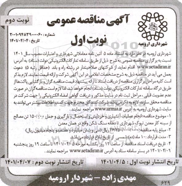 شهرداری ارومیه در نظر دارد به استناد ماده 5 آیین نامه معاملاتی شهرداری و اعتبارات مصوب سال 1401 نسبت به برگزاری مناقصه عمومی به شرح ذیل از طریق سامانه تدارکات الکترونیکی دولت ستاد به آدرس ستاد ایران اقدام نماید. از شرکتهای صلاحیتدار در رشته راه و باند (حداقل رتبه 5) دعوت به عمل می آید در مناقصه ذیل به شرح مشخصات اعلامی در این آگهی شرکت و ارائه قیمت نمایند. لازم به ذکر است کلیه مراحل برگزاری مناقصه از دریافت اسناد تا ارایه پیشنهاد قیمت مناقصه گران و بازگشایی پاکتها از طریق درگاه سامانه تدارکات الکترونیکی دولت ستاد انجام خواهد شد لذا لازم است مناقصه گران در صورت عدم عضویت قبلی مراحل ثبت نام در سایت مذکور و دریافت گواهی امضای الکترونیکی را جهت شرکت در مناقصه محقق سازند. لازم به ذکر می باشد شرکت کنندگان محترم جهت کسب اطلاعات بیشتر می توانند به سایت شهرداری ارومیه به آدرس www.urmia.ir مراجعه نمایند