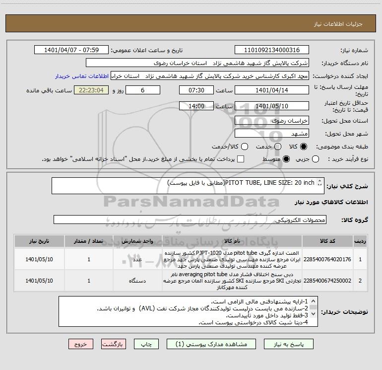 شرح کلی نیاز: PITOT TUBE, LINE SIZE: 20 inch(مطابق با فایل پیوست)