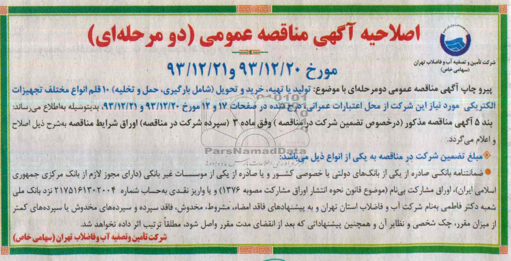 پیرو چاپ اگهی مناقصه عمومی با موضوع تولید یا تهیه ، خرید و تحویل شامل بارگیری ، حمل و تخلیه ده قلم از انواع مختلف تجهیزات الکتریکی مورد نیاز این شرکت از محل اعتبارات عمرانی درج شد در صفحات 17 و 12 مورخ 93.12.20 و 93.12.21 بدینوسیله به اطلاع می رساند