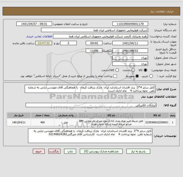 شرح کلی نیاز: کابل سایز 4*3 برند افشان استاندارد ایران مارک زربافت کرمان با هماهنگی آقای مهندس لبابی به شماره تلفن نحوه پرداخت 4 ماه اداری است
