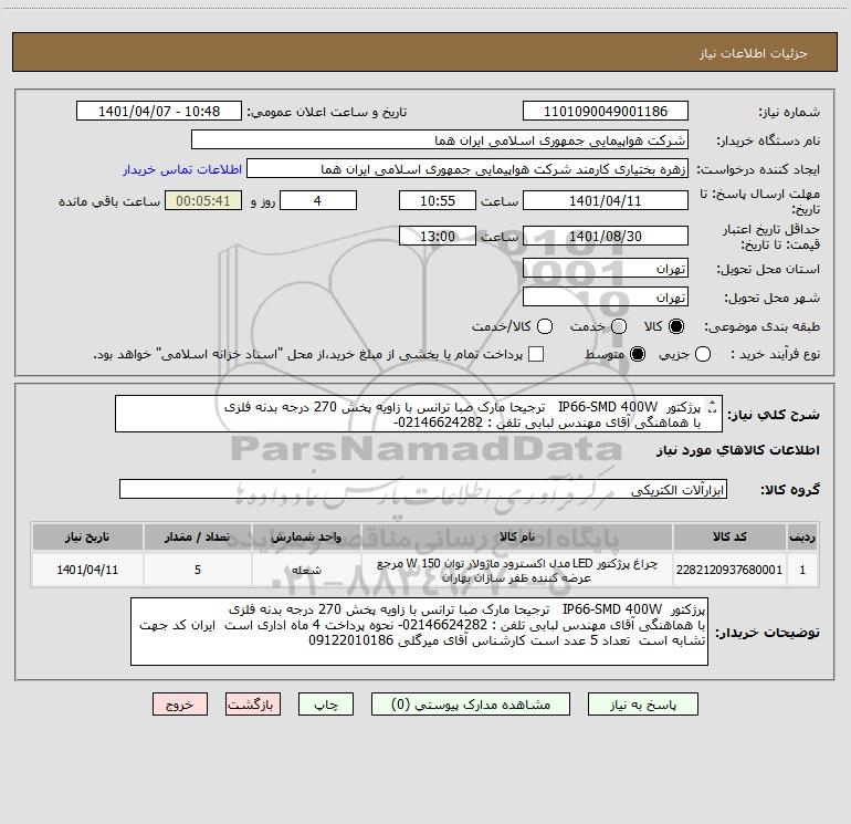 شرح کلی نیاز: پرژکتور IP66-SMD 400W ترجیحا مارک صبا ترانس با زاویه پخش 270 درجه بدنه فلزی