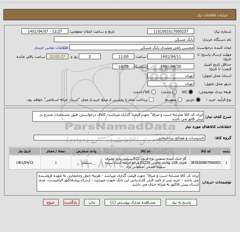 استعلام بها و موضوع استعلام استعلام ایران کد کالا مشابه است و صرفا" جهت قیمت گذاری میباشد- کالای درخواستی طبق مشخصات مندرج در پیش فاتور می باشد به اطلاع کلیه شرکت‌ها و افراد متخصص واجد شرایط می‌رساند، آگهی گذار در نظر دارد از طریق استعلام بها، نسبت به انتخاب و دریافت پیشنهادات اقدام نماید. این استعلام با کد آگهی ثبت شده در سامانه خبرگزاری پارس نماد : 4667335 منتشر شده است. مشخصات استعلام : تاریخ شروع استعلام: 1401/04/07 آخرین مهلت ارسال پیشنهاد قیمت : 1401/04/11 و محل اجرای پروژه : استان تهران میباشد. استعلام قیمت مورد درخواست : استعلام ایران کد کالا مشابه است و صرفا" جهت قیمت گذاری میباشد- کالای درخواستی طبق مشخصات مندرج در پیش فاتور می باشد با دسته‌بندی‌های تخصصی و گروه های مرتبط : تاسیسات ساختمانی, گازهای طبی و صنعتی و مخازن و تجهیزات مربوطه, استعلام اطلاع رسانی میگردد. شرایط شرکت در استعلام آنلاین : ابتدا ثبت نام در سامانه استعلام پارس نماد و تکمیل مدارک موردنیاز و بارگذاری در سامانه رعایت تمامی ضوابط و الزامات مندرج در اسناد استعلام است.