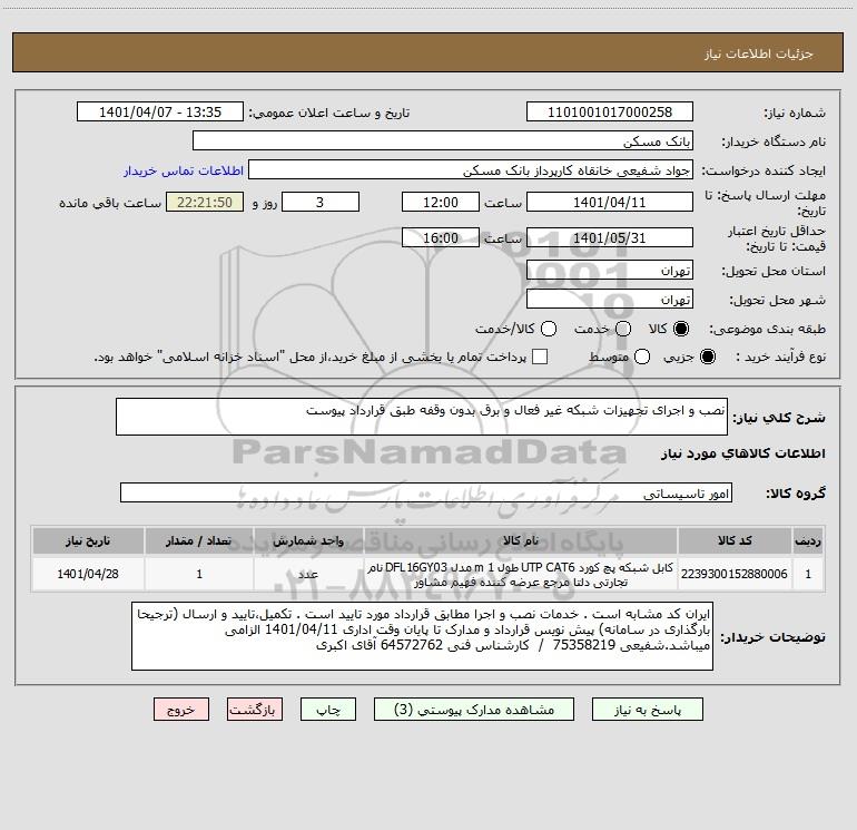 شرح کلی نیاز: نصب و اجرای تجهیزات شبکه غیر فعال و برق بدون وقفه طبق قرارداد پیوست