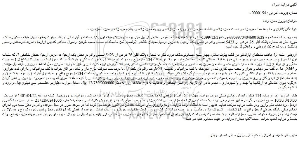 به موجب دادنامه شماره 99099704046001628مورخه1399/12/28صادره از شعبه 6دادگاه عمومی حقوقی اردبیل مبنی بردستورفروش طبقه اول یکباب ساختمان آپارتمانی در قالب پیلوت بعلاوه چهار طبقه مسکونی،ملک مورد نظر به شماره پلاک ثبتی 26 فرعی از 5423 اصلی واقع در بخش یک اردبیل به آدرس اردبیل-خیابان طالقانی 2وتقسیم ثمن حاصله به نسبت حصه طرفین ازاموال مشاعی که پس ازارجاع امربه کارشناس رسمی دادگستری به شرح ذیل ارزیابی و واعلام گردیده است.