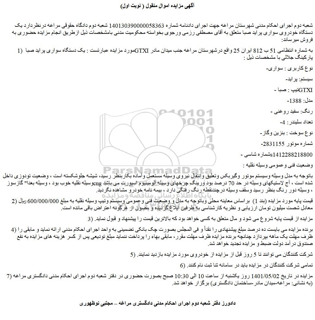 1) مورد مزایده عبارتست : یک دستگاه سواری پراید صبا GTXI به شماره انتظامی 51 ب 812 ایران 25 واقع درشهرستان مراغه جنب میدان مادر پارکینگ جلالی با مشخصات ذیل :