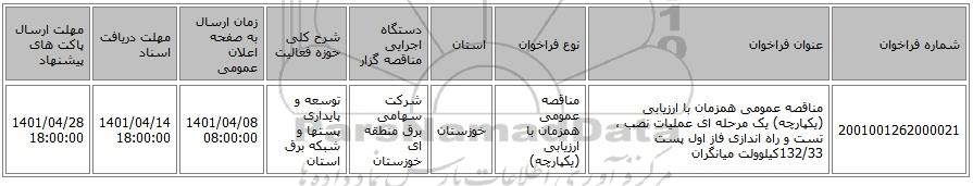 2001001262000021مناقصه عمومی همزمان با ارزیابی (یکپارچه) یک مرحله ای عملیات نصب ، تست و راه اندازی فاز اول پست 132/33کیلوولت میانگران مناقصه عمومی همزمان با ارزیابی (یکپارچه)خوزستانشرکت سهامی برق منطقه ای خوزستانتوسعه و پایداری پستها و شبکه برق استان 1401/04/08 08:00:001401/04/14 18:00:001401/04/28 18:00:00