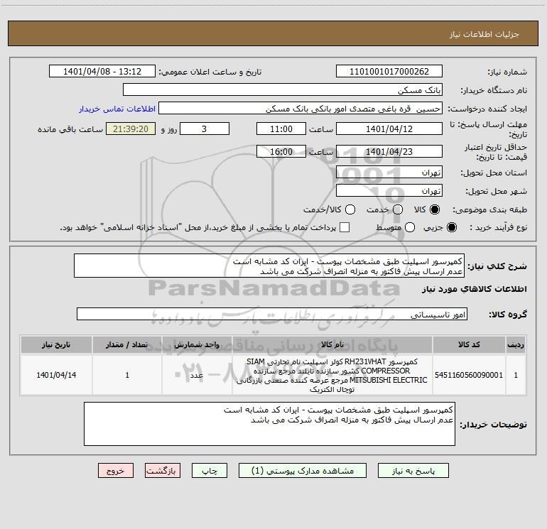 شرح کلی نیاز: کمپرسور اسپلیت طبق مشخصات پیوست - ایران کد مشابه است