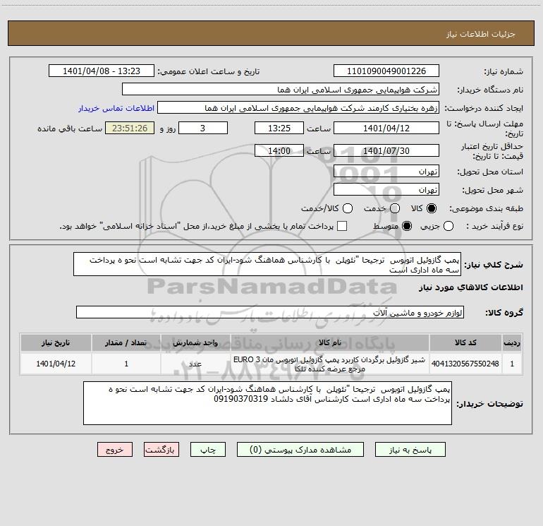 شرح کلی نیاز: پمپ گازوئیل اتوبوس ترجیحا "نئوپلن با کارشناس هماهنگ شود-ایران کد جهت تشابه است نحو ه پرداخت سه ماه اداری است