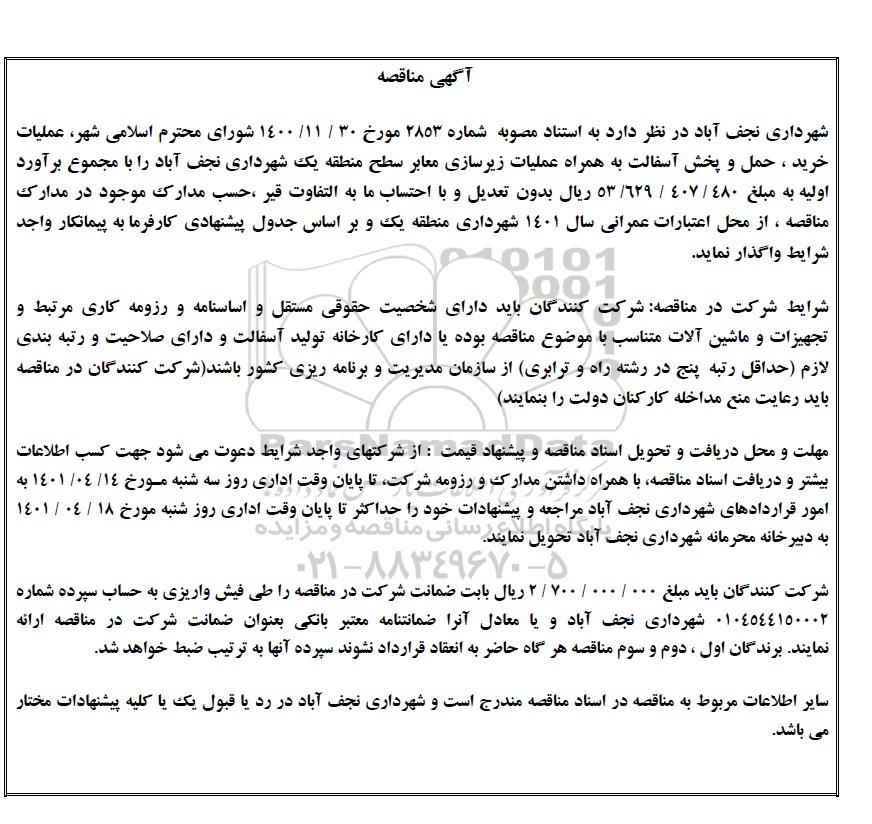 شهرداری نجف آباد به استناد مصوبه شماره  2853 مورخ 1400.11.30  شورای محترم اسلامی شهر، عملیات خرید، حمل و پخش آسفالت به همراه عملیات زیرسازی معابر سطح منطقه  یک شهرداری نجف آباد را با مچجموع برآورد تقریبی اولیه به مبلغ 52.629.407.480 ریال بدون تعدیل و با احتساب مابه التفاوت قیمت قیر ، حسب مدارک موجود در مدارک مناقصه از محل اعتبارات عمرانی سال 1401 شهرداری و براساس جدول پیشنهادی کارفرما به پیمانکار واجد شرایط واگذار نماید