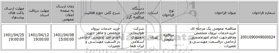 | 2001090049000024 | مناقصه عمومی یک مرحله ای خریدخدمات نیروی متخصص وماهرجهت انجام امورتخصصی ارجاعی درقسمت مهندسی و تعمیرات | مناقصه عمومی | تهران | شرکت هواپیمایی جمهوری اسلامی ایران هما | خرید خدمات نیروی متخصص و ماهر جهت انجام امور تخصصی ارجاعی در قسمت مهندسی و تعمیرات | 1401/04/08 15:00:00 | 1401/04/12 19:00:00 | 1401/04/25 19:00:00 |