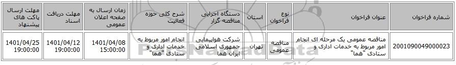 | 2001090049000023 | مناقصه عمومی یک مرحله ای انجام امور مربوط به خدمات اداری و ستادی "هما" | مناقصه عمومی | تهران | شرکت هواپیمایی جمهوری اسلامی ایران هما | انجام امور مربوط به خدمات اداری و ستادی "هما" | 1401/04/08 15:00:00 | 1401/04/12 19:00:00 | 1401/04/25 19:00:00 |