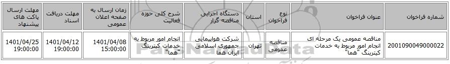 مناقصه، مناقصه عمومی یک مرحله ای انجام امور مربوط به خدمات کیترینگ "هما", مناقصه، مناقصه عمومی یک مرحله ای انجام امور مربوط به خدمات کیترینگ "هما"