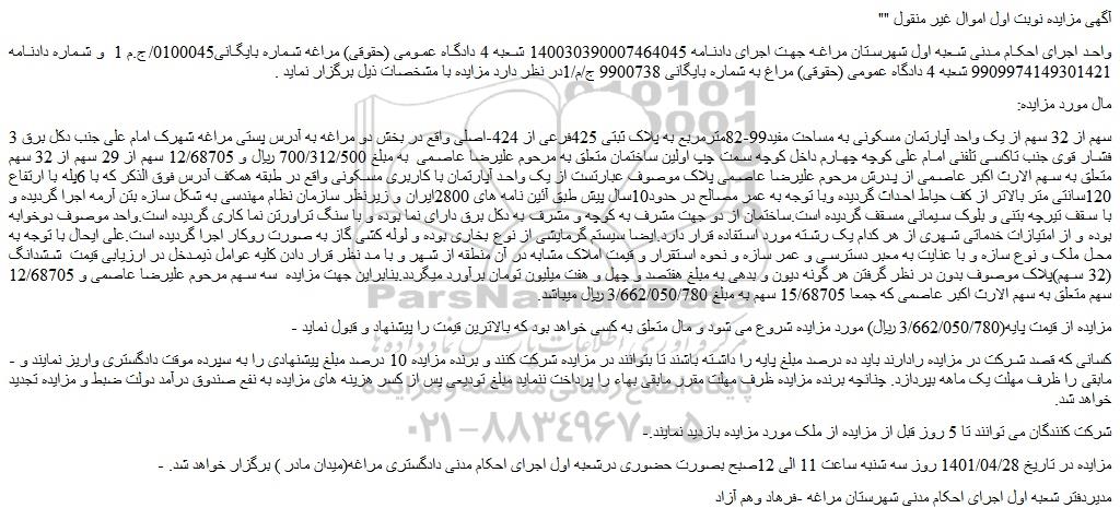3 سهم از 32 سهم از یک واحد آپارتمان مسکونی به مساحت مفید99-82مترمربع به پلاک ثبتی 425فرعی از 424-اصلی واقع در بخش دو مراغه به آدرس پستی مراغه شهرک امام علی جنب دکل برق فشار قوی جنب تاکسی تلفنی امام علی کوچه چهارم داخل کوچه سمت چپ اولین ساختمان متعلق به مرحوم علیرضا عاصمی به مبلغ 700/312/500 ریال و 12/68705 سهم از 29 سهم از 32 سهم متعلق به سهم الارث اکبر عاصمی از پدرش مرحوم علیرضا عاصمی پلاک موصوف عبارتست از یک واحد آپارتمان با کاربری مسکونی واقع در طبقه همکف آدرس فوق الذکر که با 6پله با ارتفاع 120سانتی متر بالاتر از کف حیاط احداث گردیده وبا توجه به عمر مصالح در حدود10سال پیش طبق آئین نامه های 2800ایران و زیرنظر سازمان نظام مهندسی به شکل سازه بتن آرمه اجرا گردیده و با سقف تیرچه بتنی و بلوک سیمانی مسقف گردیده است.ساختمان از دو جهت مشرف به کوچه و مشرف به دکل برق دارای نما بوده و با سنگ تراورتن نما کاری گردیده است.واحد موصوف دوخوابه بوده و از امتیازات خدماتی شهری از هر کدام یک رشته مورد استفاده قرار دارد.ایضا سیستم گرمایشی از نوع بخاری بوده و لوله کشی گاز به صورت روکار اجرا گردیده است.علی ایحال با توجه به محل ملک و نوع سازه و با عنایت به معبر دسترسی و عمر سازه و نحوه استقرار و قیمت املاک مشابه در آن منطقه از شهر و با مد نظر قرار دادن کلیه عوامل ذیمدخل در ارزیابی قیمت ششدانگ (32 سهم)پلاک موصوف بدون در نظر گرفتن هر گونه دیون و بدهی به مبلغ هفتصد و چهل و هفت میلیون تومان برآورد میگردد.بنابراین جهت مزایده سه سهم مرحوم علیرضا عاصمی و 12/68705 سهم متعلق به سهم الارث اکبر عاصمی که جمعا 15/68705 سهم به مبلغ 3/662/050/780 ریال میباشد.