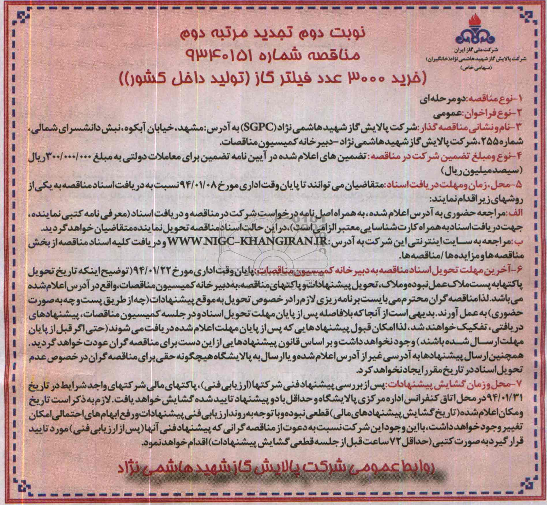 مناقصه خرید 3000 عدد فیلتر گاز تولید داخل کشور از کلیه افراد متخصص و شرکتها واجد شرایط دعوت به عمل میآید در مناقصه با کد خبرگزاری پارس نماد: 467411 شرکت نمایند.