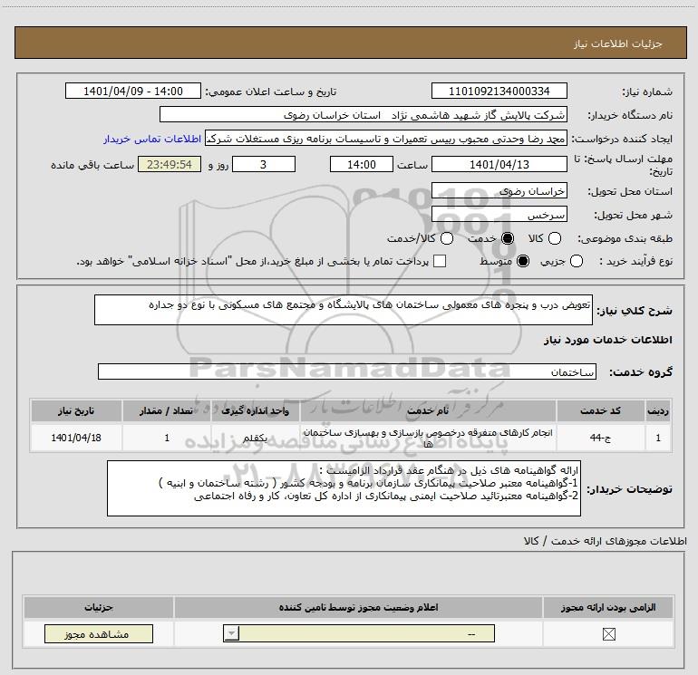 شرح کلی نیاز: تعویض درب و پنجره ھای معمولی ساختمان ھای پالایشگاه و مجتمع های مسکونی با نوع دو جداره