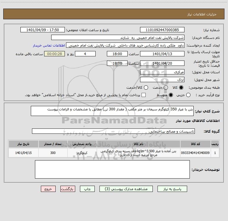 شرح کلی نیاز: بتن با عیار 350 کیلوگرم سیمان بر متر مکعب ( مقدار 300 تن) مطابق یا مشخصات و الزامات پیوست